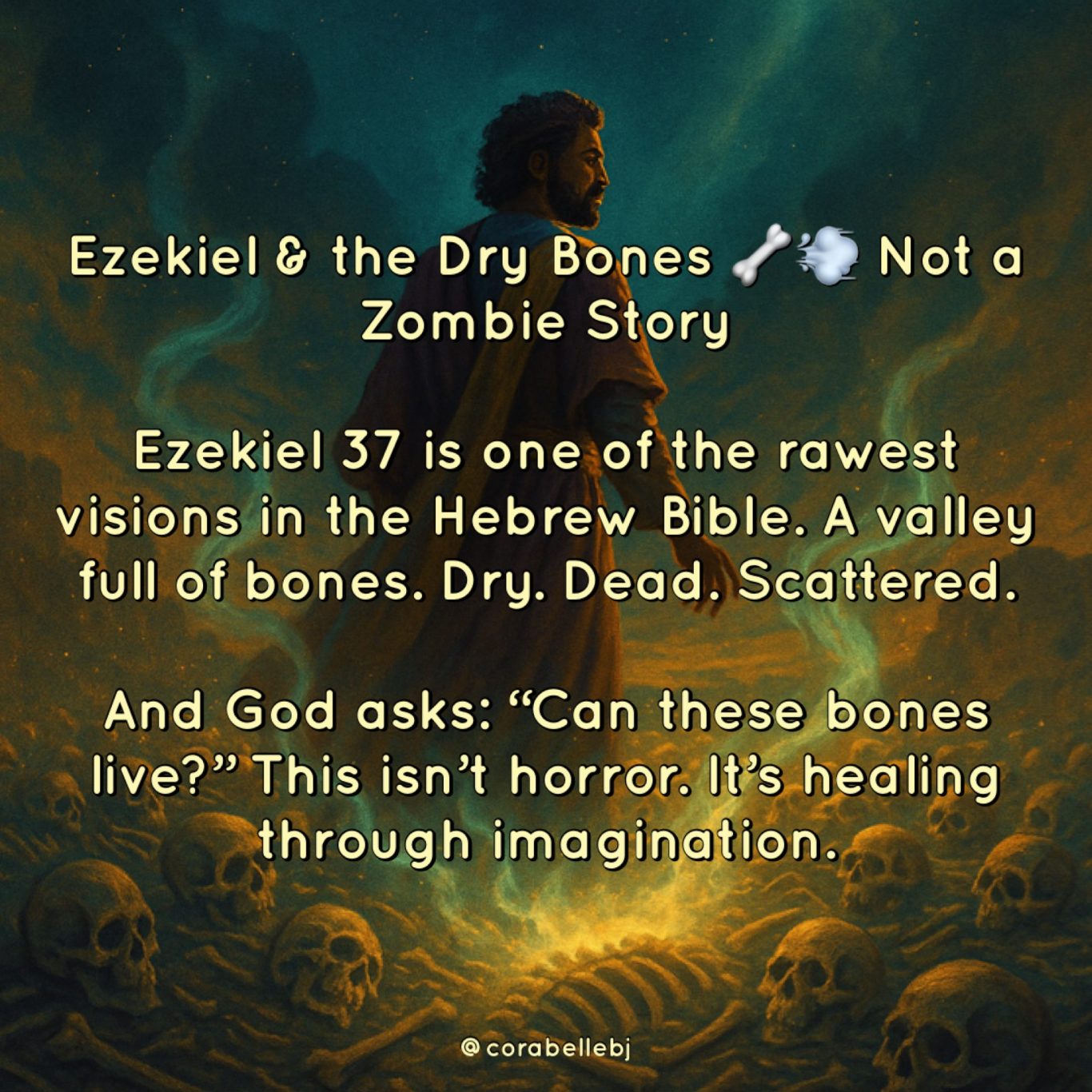 Ezekiel 37 is one of the rawest visions in the Hebrew Bible. A valley full of bones. Dry. Dead. Scattered And God asks: “Can these bones live?” This isn’t horror. It’s healing through imagination.
