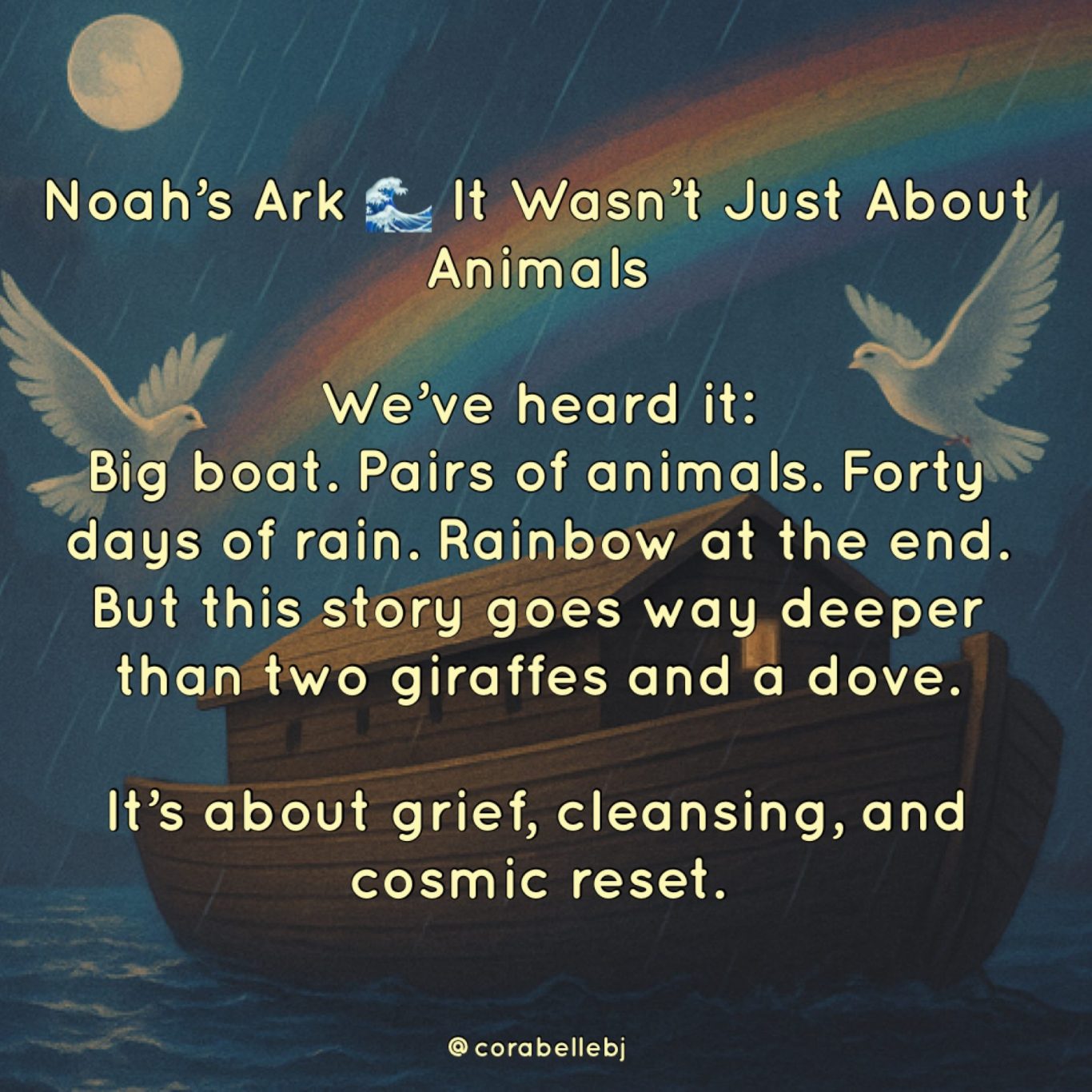 I grew up being told the story of Noah’s Ark like it was a holy bedtime tale with animals two by two, a chosen family, and a rainbow promise. But nobody told me that this story was also used to justify erasure, to preach fear, and to make divine love feel conditional. And now? I don’t see a holy lesson in mass destruction. I see a warning about what happens when people mistake control for righteousness. I see a story that’s been twisted to scare people into silence. I was never meant to be silent.